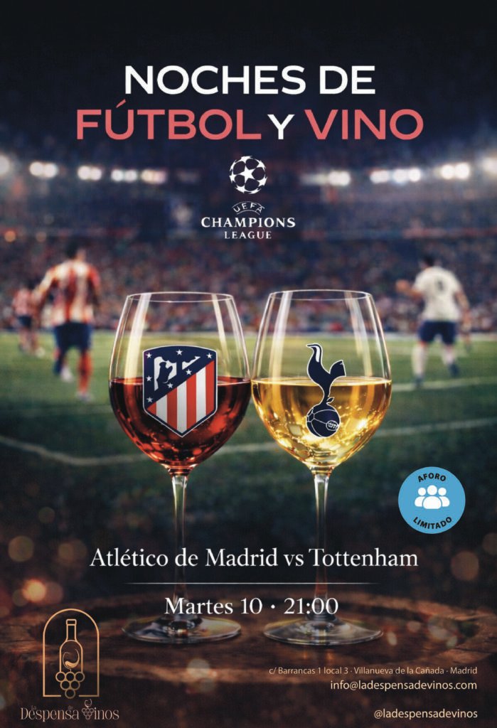 Este Martes 10 de Marzo ven con nosotros a ver el partido de Champions entre el Atlético de Madrid vs. Tottenham a las 21:00. Te esperamos con una copita de vino!